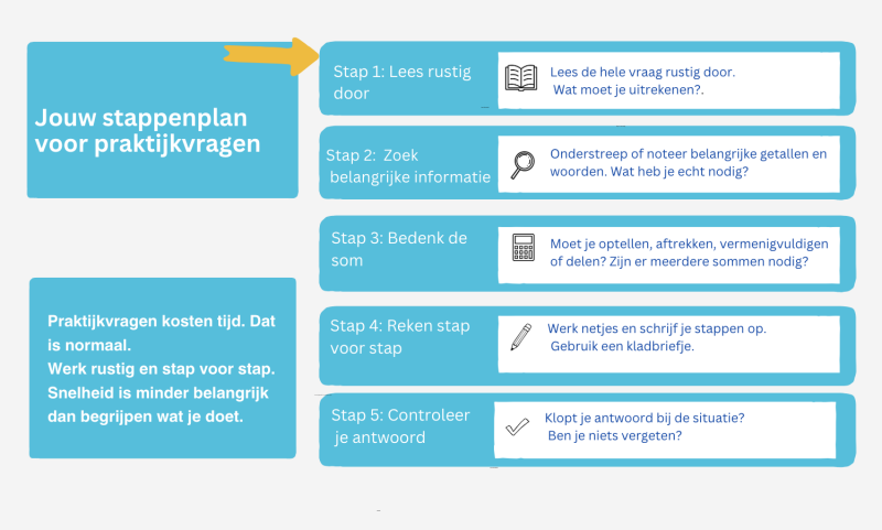 Op deze pagina leer je hoe je praktijkrekenvragen stap voor stap kunt oplossen met het stappenplan.
