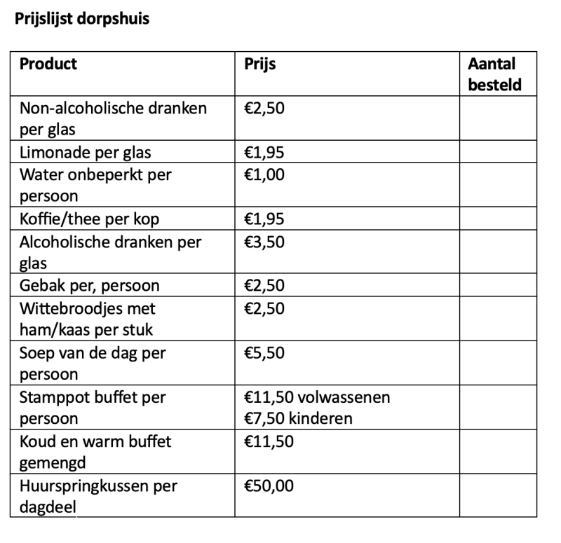 Het echtpaar de Boer is 50 jaar getrouwd en wil in het dorpshuis een feest geven voor de familie. De familie bestaat inclusief het echtpaar de Boer uit 45 personen waarvan 35 volwassenen en 10 kinderen. Het echtpaar wil graag 2 koppen koffie met gebak voor de volwassenen en 2 glazen limonade met gebak voor de kinderen. Na het koffiemoment willen ze graag een stamppot buffet voor iedereen met voor alle volwassenen 2 alcoholische consumpties en voor de kinderen 2 non-alcoholische consumpties, voor de rest krijgt iedereen water. Ook willen ze de gehele dag (ochtend en middag) een springkussen huren. Hieronder staat de prijslijst van het dorpshuis. Het echtpaar de Boer heeft €1000,00 gespaard voor het feest. Bereken wat het echtpaar in totaal moet betalen voor het feest en bereken of ze voldoende gespaard hebben of niet. geef ook aan hoeveel het echtpaar tekort komt of hoeveel ze overhouden.